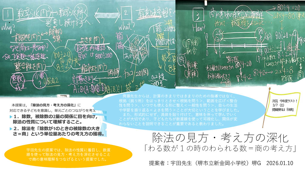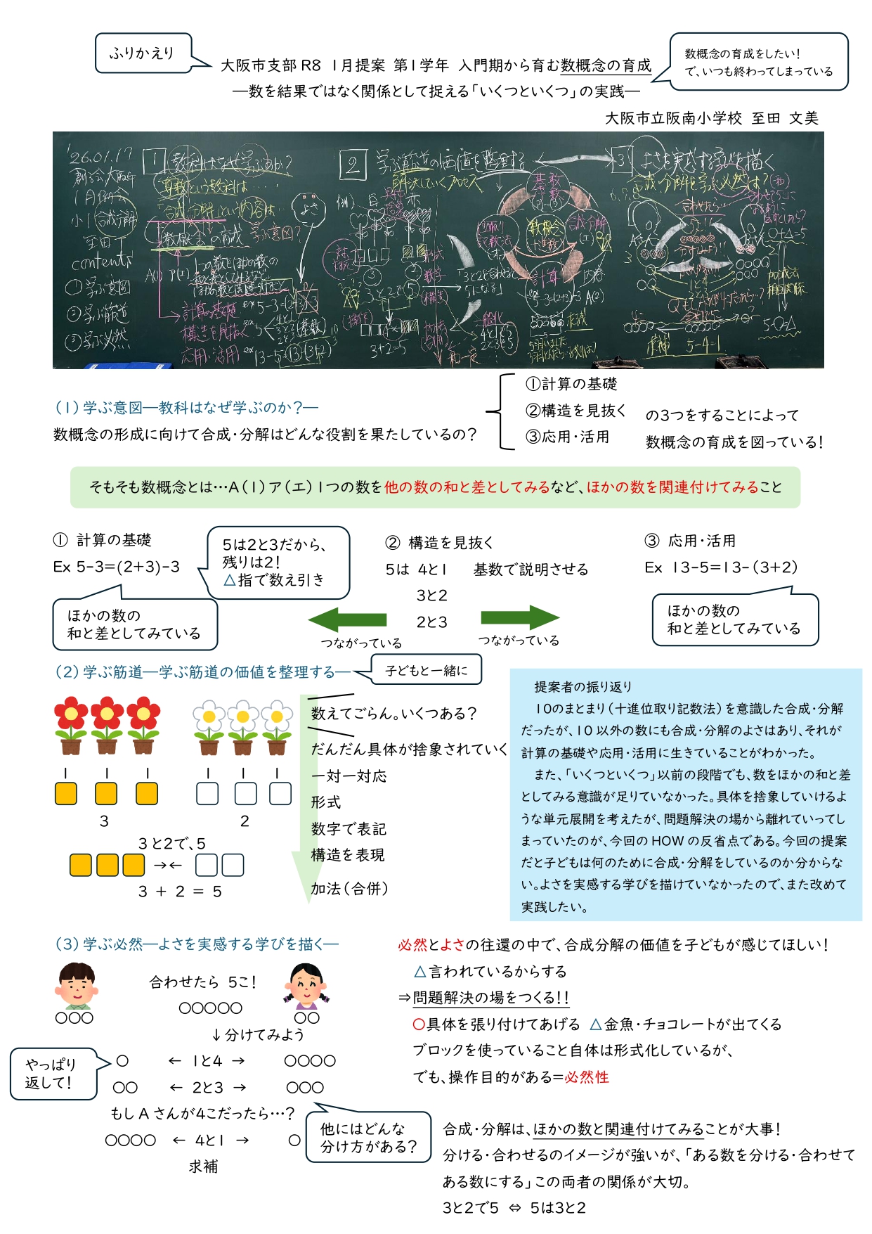 - 分数を扱う際は、割合との関連、小数との関連を意識することをご指導いただき、2年生に1/3を入れた意図、そしてそれにつながる3年生の分数との関連を考えると、割合的な見方から量の見方に分数の範囲を広げていくような単元計画が必要だと感じました。