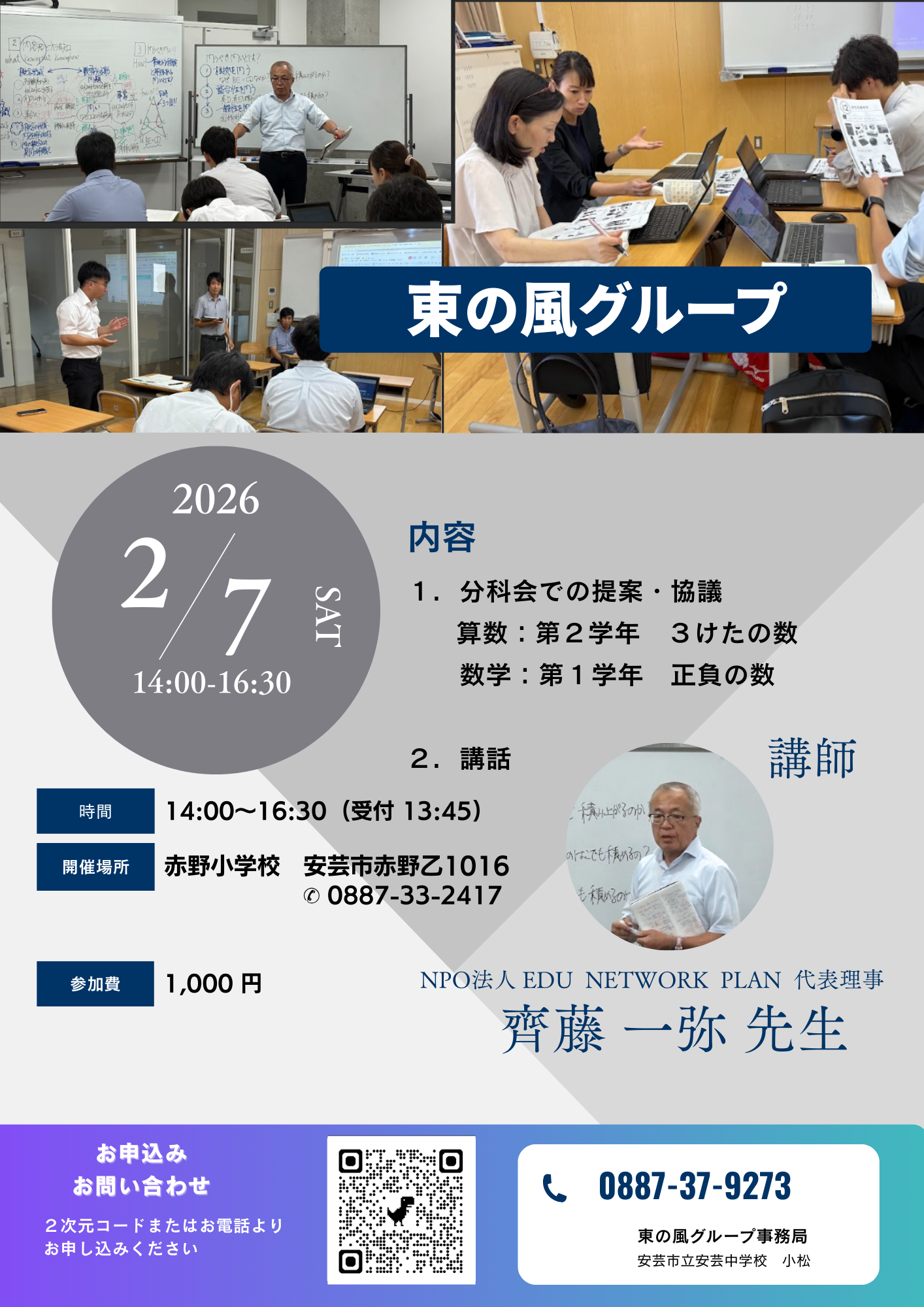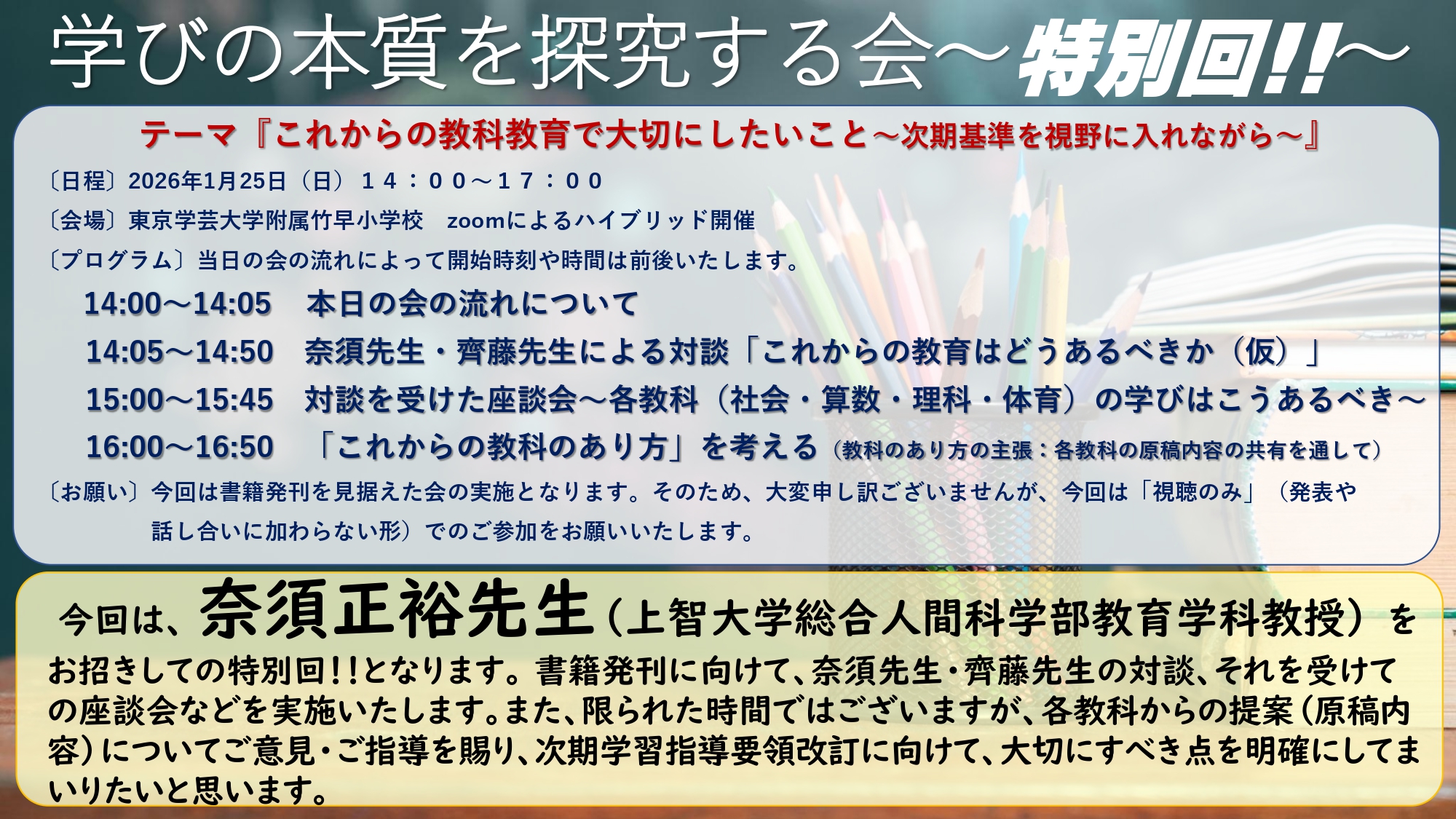 土曜日学習会一大企画がついに実現しました!昨年、東京学芸大学附属小金井小のセミナーに参加した際、加固先生の「島根に行きます!」という言葉を真に受け、計画を進めること一年、ついに小金井小の加固希支男先生、尾形祐樹先生をお招きして算数授業研修会を行うことができました。さらに、文部科学省教科調査官の笠井先生、学力調査官の直海先生も来てくださり、各藤先生含め5名の超豪華共演となりました。当日は70名の参加者と大研修会となりました。
