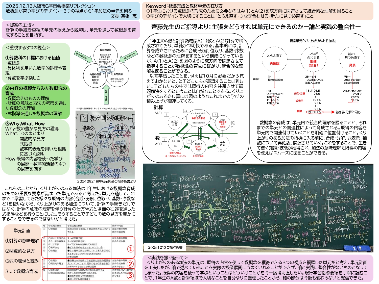 5年算数小数のかけ算の単元で「自ら問いをもつ子どもの育成~統合的・発展的に考える指導を通して~」というテーマで実践を行った。第1・2時に、整数×小数を学習した後、第3時に小数×小数の学習を行う。この第3時で、ここまでの学習と比較し、共通点や相違点を明らかにしながら統合的に考えること、発展的に考えた問題を、全体で共有する場をせっていすることを指導のポイントとした提案であった。